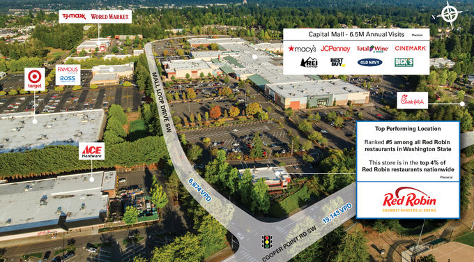 The offering presents the opportunity to acquire a long-standing single tenant Red Robin, ideally situated at Capital Mall in Olympia, WA. This prime free-standing net lease property is located within the area’s leading regional shopping destination, benefitting from robust consumer traffic and strong retail synergy with Capital Mall producing 6.5M annual visits (Placer.ai).